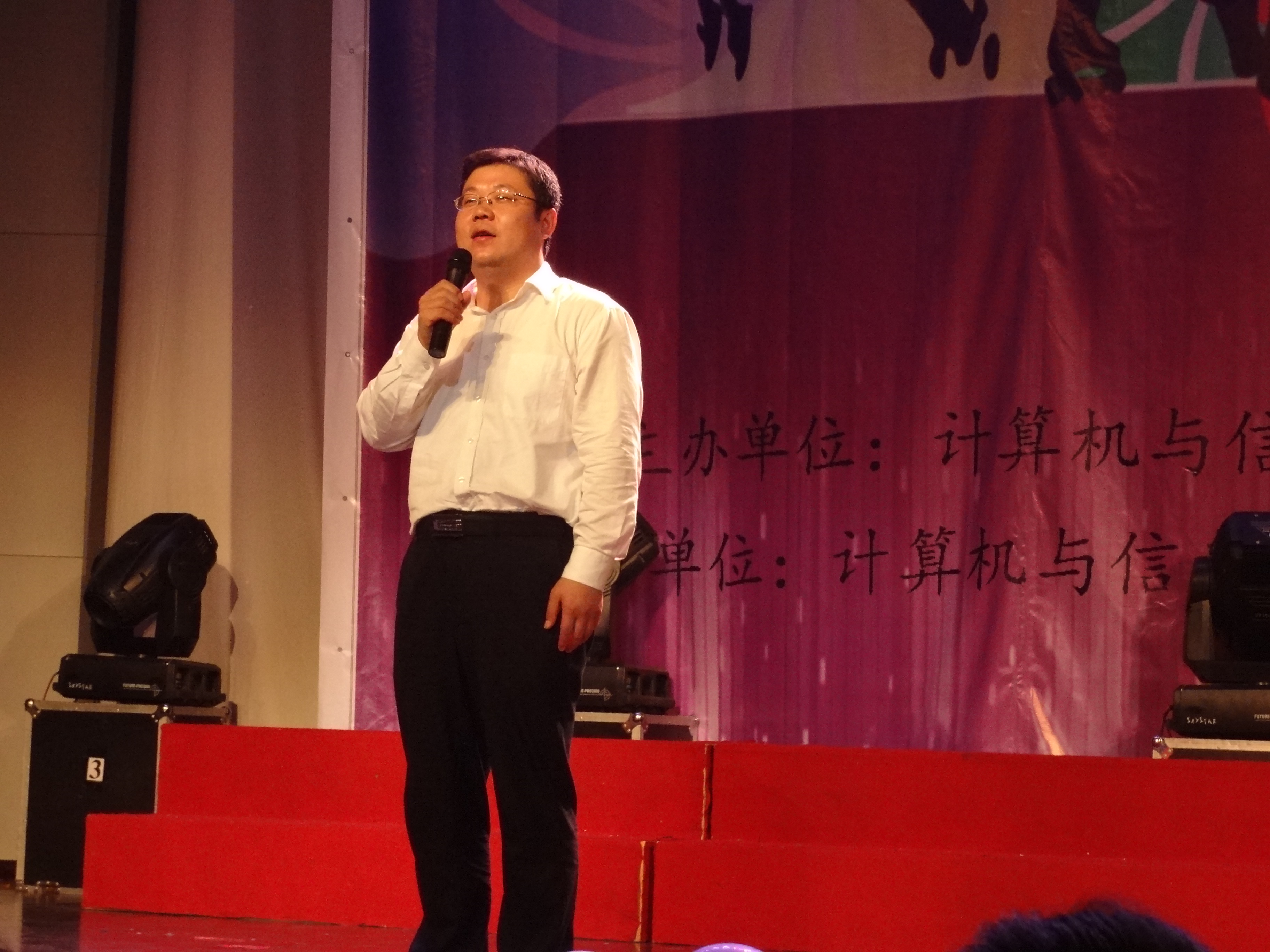 20131011日,计算机与信息学院学生会于博学楼报告厅举办了主题为“青春源代码 梦想C++”的迎新晚会。院长许峰、院党委书记张雪刚、副院长万定生、副院长李臣明、院党委副书记张炜以及班导师代表、各年级辅导员等出席了晚会。出席晚会的还有南京大学、东南大学、南京理工大学、南京航空航天大学、南京林业大学、南京师范大学等兄弟院校的学生代表。
